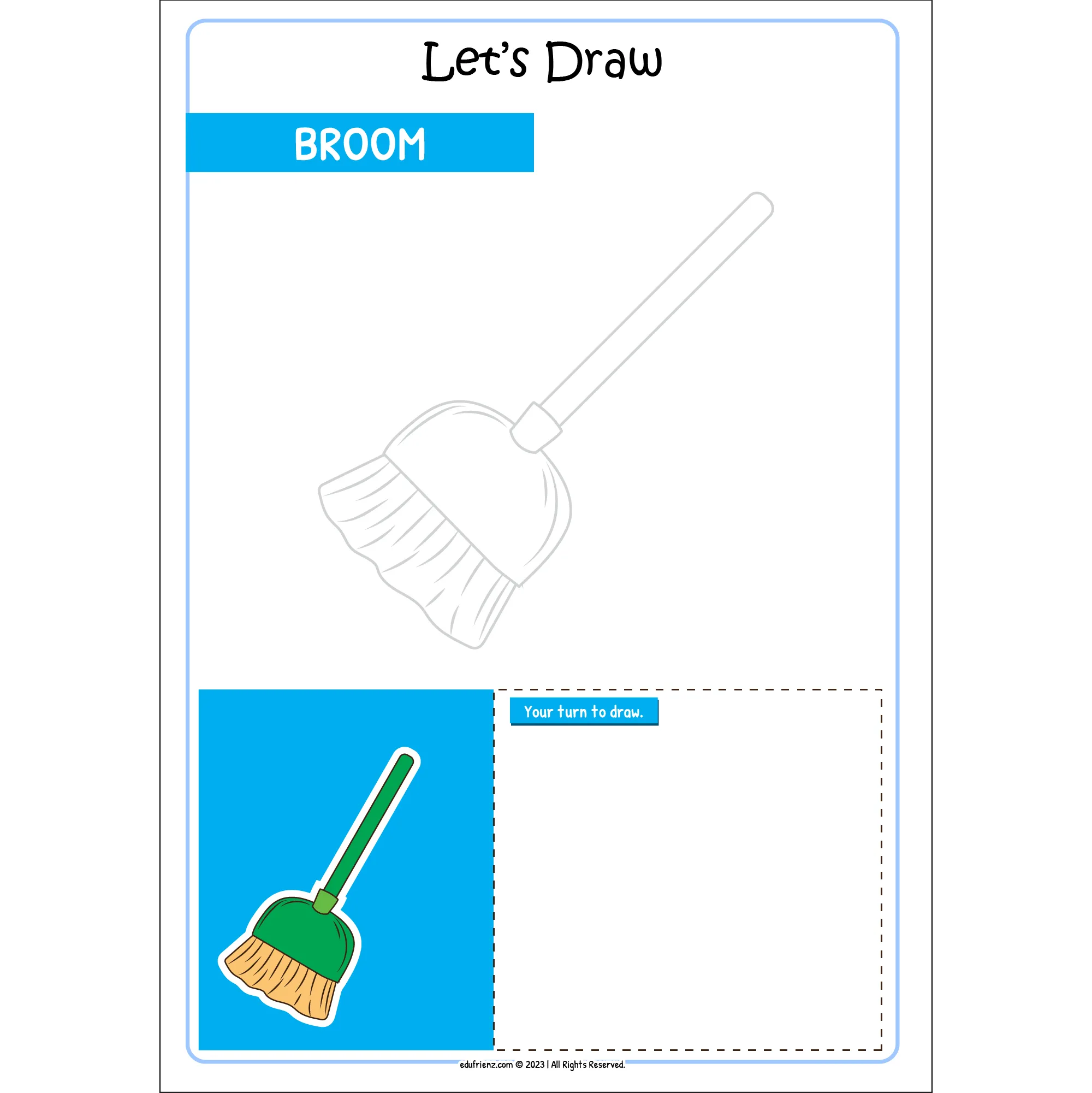 - Step-by-Step Tracing: Simple instructions guide your child through the process of tracing and drawing various cleaning tools, building confidence and fine motor skills.