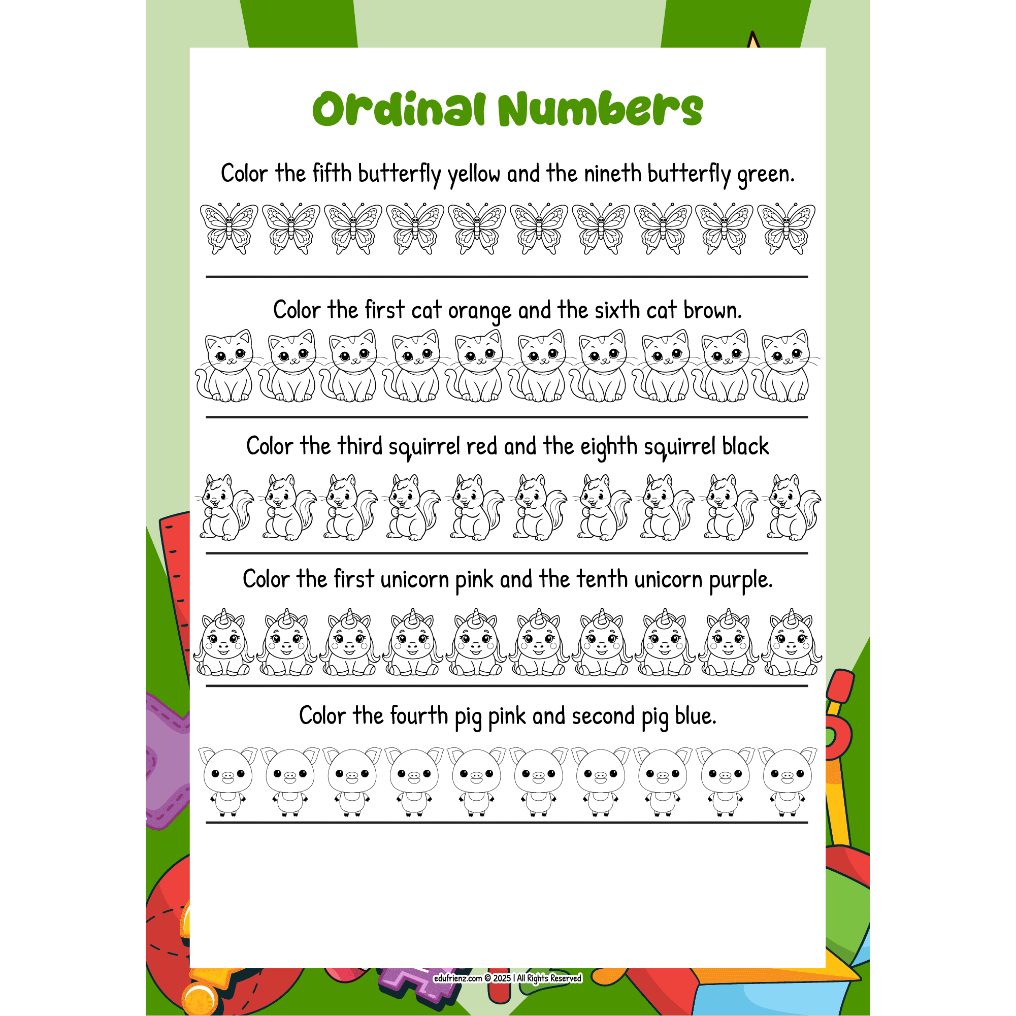 Across 19 pages, learners will practice identifying and using ordinal numbers through examples, coloring exercises, and sequence recognition. From labeling objects in a row to coloring specific animals based on their position, children reinforce math concepts while having fun.